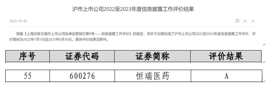 近日,上海交易所公布了沪市上市公司2022-2023年度信息披露工作评价结果,凭借在信息披露、规范运作以及投资者关系管理等方面的优秀表现,AG官网医药获评A级。本次共有2160家沪市上市公司参评(包括499家科创板上市公司),评价等级从高到低依次为A、B、C、D四类,获得A类评价的上市公司占比约18.5%。